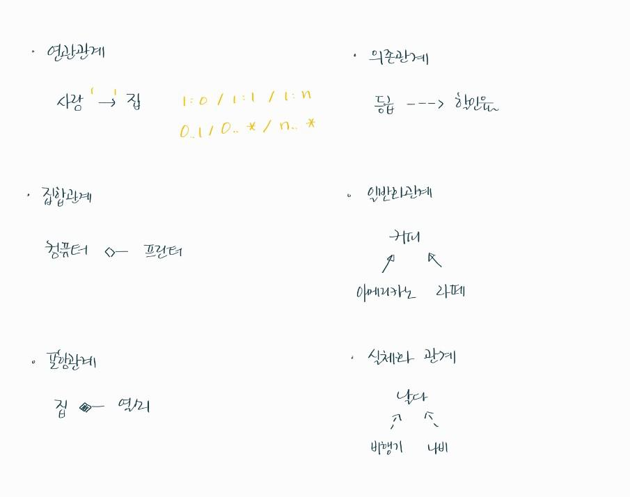 1) 연관관계 : 두개 이상의 사물이 관계된 상태, 사물을 실선으로 연결, 방향을 나타냄, 1:1, 1:n, 0..1, 0..*