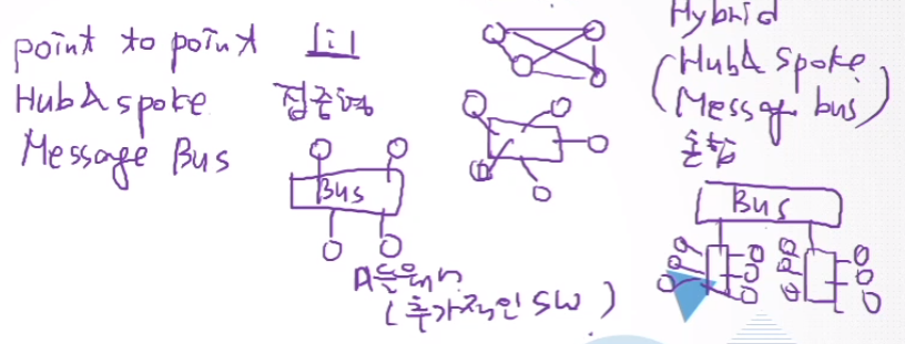 EAI : 내부, 연계, 통합 - point to point방식 : 1:1 / hub & spoke : 집중형 / message bus : 미들웨어(운영체제 외 추가적 서비스), hybrid : hub & spoke + message bus