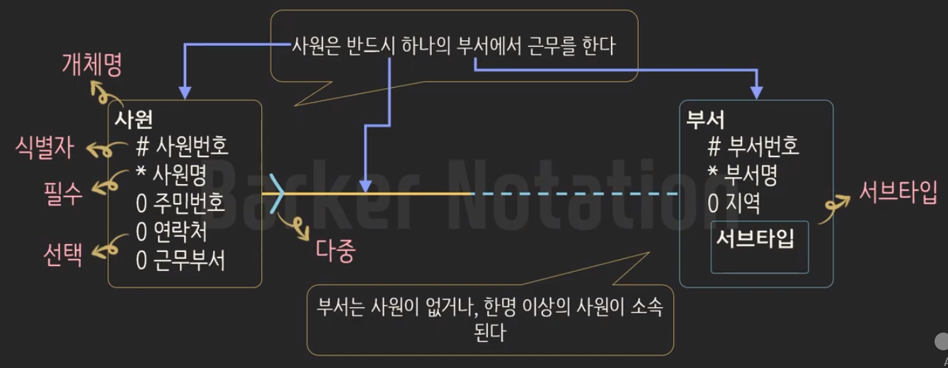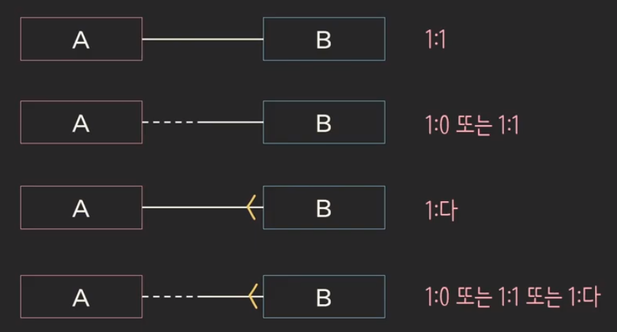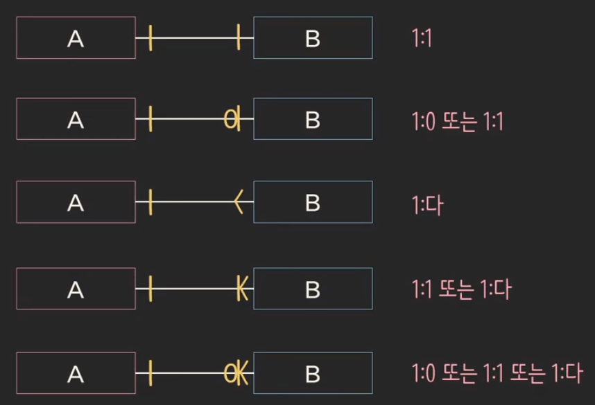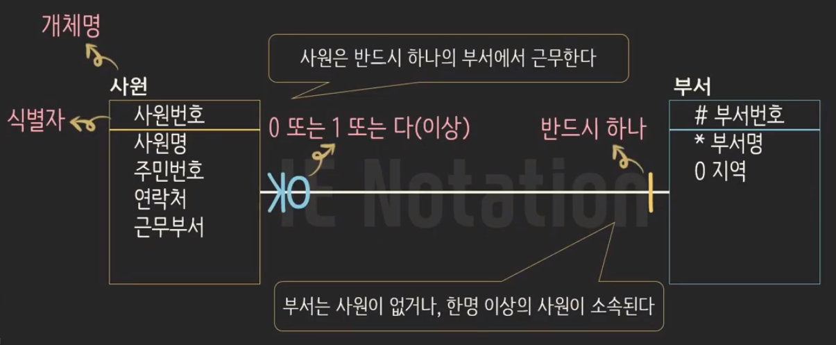 관계의 표현 - 1:1, 1:0, 1:다 (데이터의 접근빈도, 성능, 보안여부에 따라 관계를 나누고 관계를 맺음), 다:다(x, 종속성판단, 정규화, 문서화 불가 -> 새로운 관계개체를 통해 규칙설정)