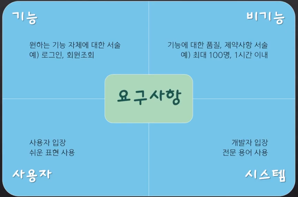 ⓑ 요구사항 분류 : 특정한 기준으로 분류(기능과 비기능, 우선순위, 과정과 결과)