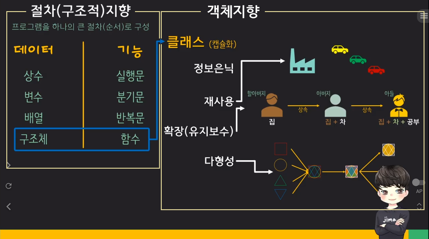 1) 클래스 : 데이터와 기능을 묶어서 캡슐화한 것, 재사용, 확장(유지보수) 용이