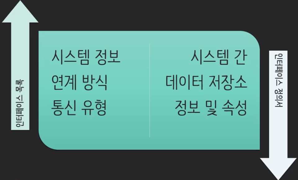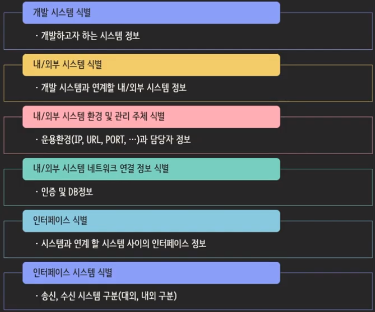 1) 인터페이스 시스템 식별 : 개발 시스템 식별(개발하고자 하는 시스템 정보), 내외부 시스템 식별(개발 시스템과 연계할 내외부 시스템 정보), 내외부 시스템 환경 및 관리 주체 식별(운용환경(IP, URL, PORT..)과 담당자 정보), 내외부 시스템 네트워크 연결정보 식별(인증 및 DB정보), 인터페이스 식별(시스템과 연계할 시스템 사이의 인터페이스 정보), 인터페이스 시스템 식별(송신, 수신 시스템 구분(대외, 내외 구분))