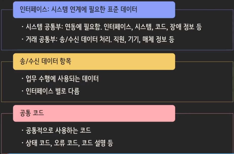 2) 식별 대상 데이터 : 인터페이스((시스템연계에 필요한 표준 데이터), 시스템 공통부(연동에 필요함, 인터페이스, 시스템, 코드, 장애정보 등), 송수신 데이터 항목(업무 수행에 사용되는 데이터, 인터페이스 별로 다름), 공통코드(공통적으로 사용하는 코드, 상태코드, 오류코드, 코드 설명 등))
