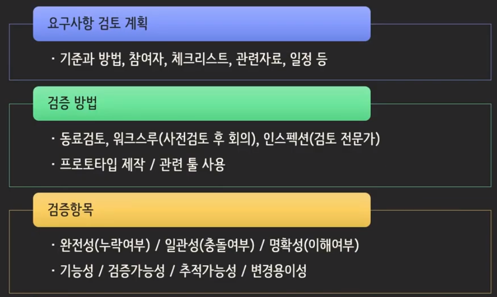 3) 요구사항 검증 : 요구사항 검토계획(기준과 방법, 참여자, 체크리스트, 관련자료, 일정 등), 검증방법(동료검토, 워크스루(사전검토 후 회의), 인스펙션(검토 전문가), 프로토타입제작, 관련 툴 사용), 검증항목(완전성(누락여부), 일관성(충돌여부), 명확성(이해여부), 기능성, 검증가능성, 추적가능성, 변경용이성