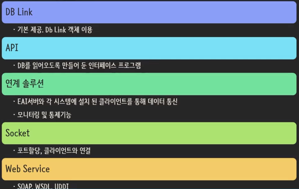 1) 시스템 연계기술 : DB Link(기본제공, DB Link 객체 이용), API(DB를 읽어오도록 만들어둔 인터페이스 프로그램), 연계솔루션(EAI서버와 각 시스템에 설치된 클라이언트를 통해 데이터통신, 모니터링 및 통제기능), Socket(포트할당, 클라이언트와 연결), Web service(SOAP, WSDL,UDDI)