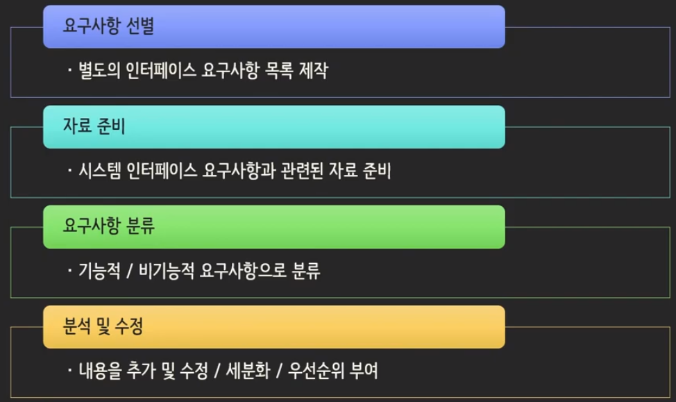 2) 인터페이스 분석 절차 : 요구사항 선별(별도의 인터페이스 요구사항 목록 제작), 자료준비(시스템 인터페이스 요구사항과 관련된 자료준비), 요구사항 분류(기능적, 비기능적 요구사항으로 분류), 분석 및 수정(내용을 추가 및 수정, 세분화, 우선순위 부여)