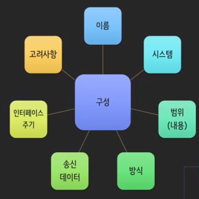 1) 요구사항 명세서 구성 : 이름, 시스템, 범위(내용), 방식, 송신데이터, 인터페이스 주기, 고려사항