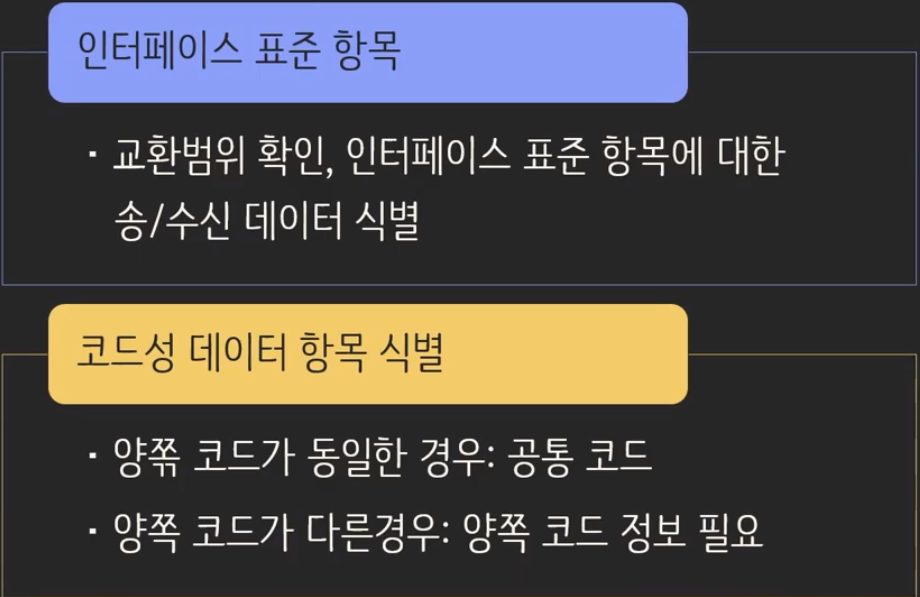 4) 송수신 데이터 식별 : 인터페이스 표준항목(교환범위확인, 인터페이스 표준항목에 대한 송수신 데이터 식별), 코드성 데이터 항목 식별(양쪽 코드가 동일한 경우:공통코드, 다른경우: 양쪽 코드정보 필요)