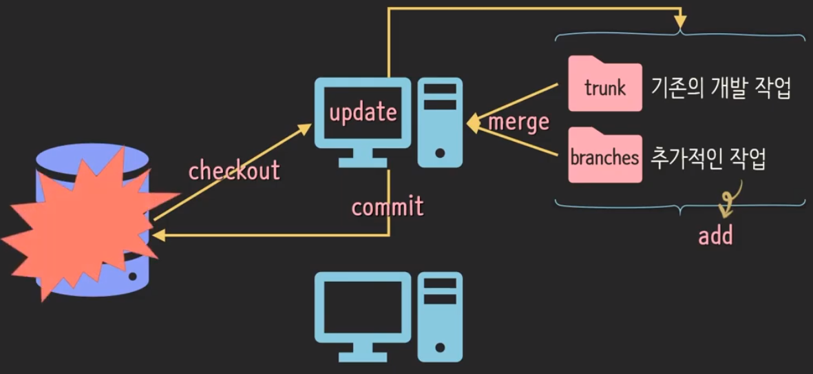 2) 클라이언트/서버방식(SVN) : 여러대의 클라이언트에서 개발 및 테스팅 가능, 서버가 모든 버전관리를 담당하고있어 서버에 문제가 생기면 작업이 불가능