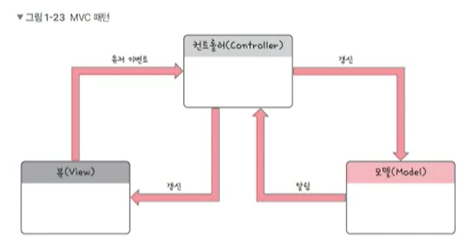 #_MVC 패턴 : 모델(Model)-뷰(View)-컨트롤러(Controller)로 이루어진 디자인 패턴, 개발 프로세스에서 구성요소를 세가지로 구분하여 각각의 구성요소에만 집중한 개발 가능, 재사용성ㆍ확장성 용이, 애플리케이션이 복잡해질수록 모델과 뷰의 관계가 복잡해짐
