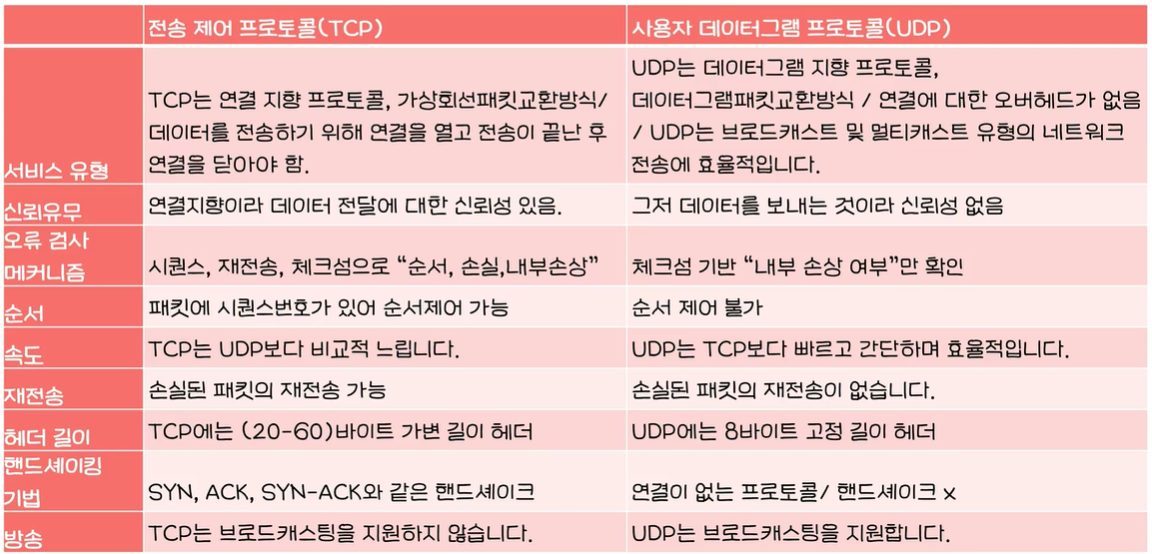 TCP : 패킷 사이의 순서 보장, 연결지향 프로토콜(3웨이 핸드쉐이크)을 사용해서 연결하여 신뢰성을 구축, 수신여부를 확인하는 '가상회선 패킷 교환방식' 을 사용
