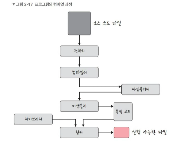 4. 링커 : 프로그램 내의 라이브러리 함수, 다른 파일들과 목적 코드를 결합하여 실행팡리 생성, 실행 파일의 확장자는 .exe 또는 .out