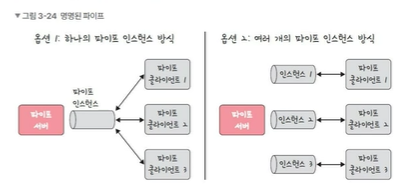 *명명파이프 : 파이프서버와 하나 이상의 파이프 클라이언트 간의 통신을 위해 명명된 단방향/이중 파이프, 클라이언트-서버 통신을 위한 별도의 파이프 제공, 여러 파이프 동시 사용 가능, 컴퓨터의 프로세스끼리 또는 다른 네트워크상의 컴퓨터와 통신 가능