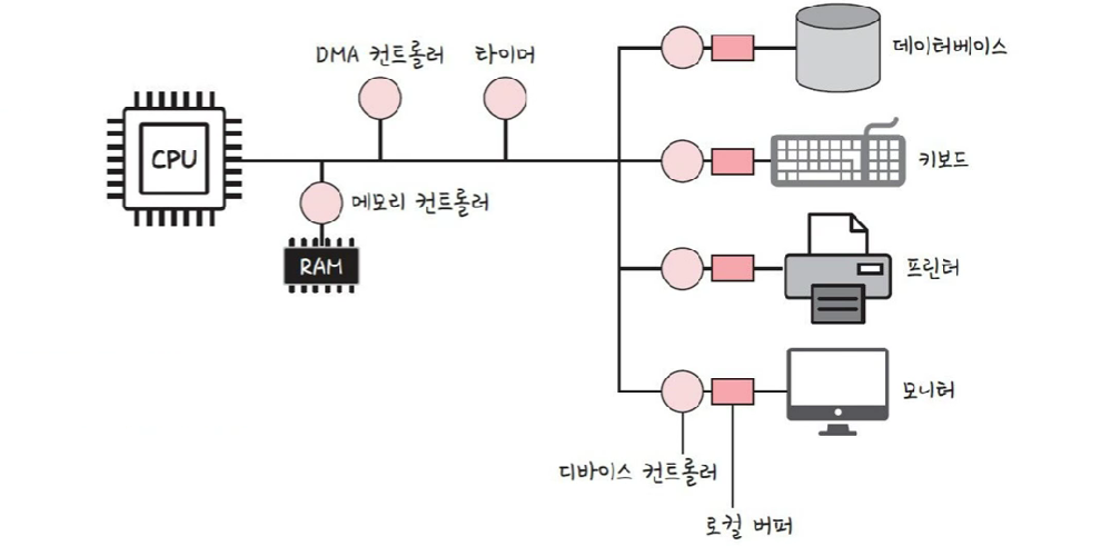 | 디바이스 컨트롤러 | 컴퓨터와 연결되어 있는 IO 디바이스(키보드, 프린터 등)들의 작은 CPU | |