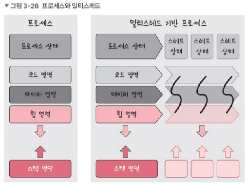 *스레드에서의 컨텍스트 스위칭 : 스레드는 스택 영역을 제외한 모든 메모리를 공유하기때문에 스레드 컨텍스트 스위칭의 경우 비용, 시간이 줄어듦