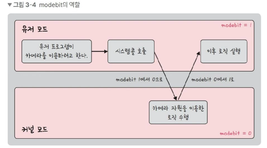 ex. 유저모드에서 카메라를 실행할 경우 해킹방지를 위해 시스템콜(올바른 요청이닞 확인)->커널모드에서 카메라 on (0) ->유저모드에서 카메라 실행(1) 순으로 카메라가 실행됨