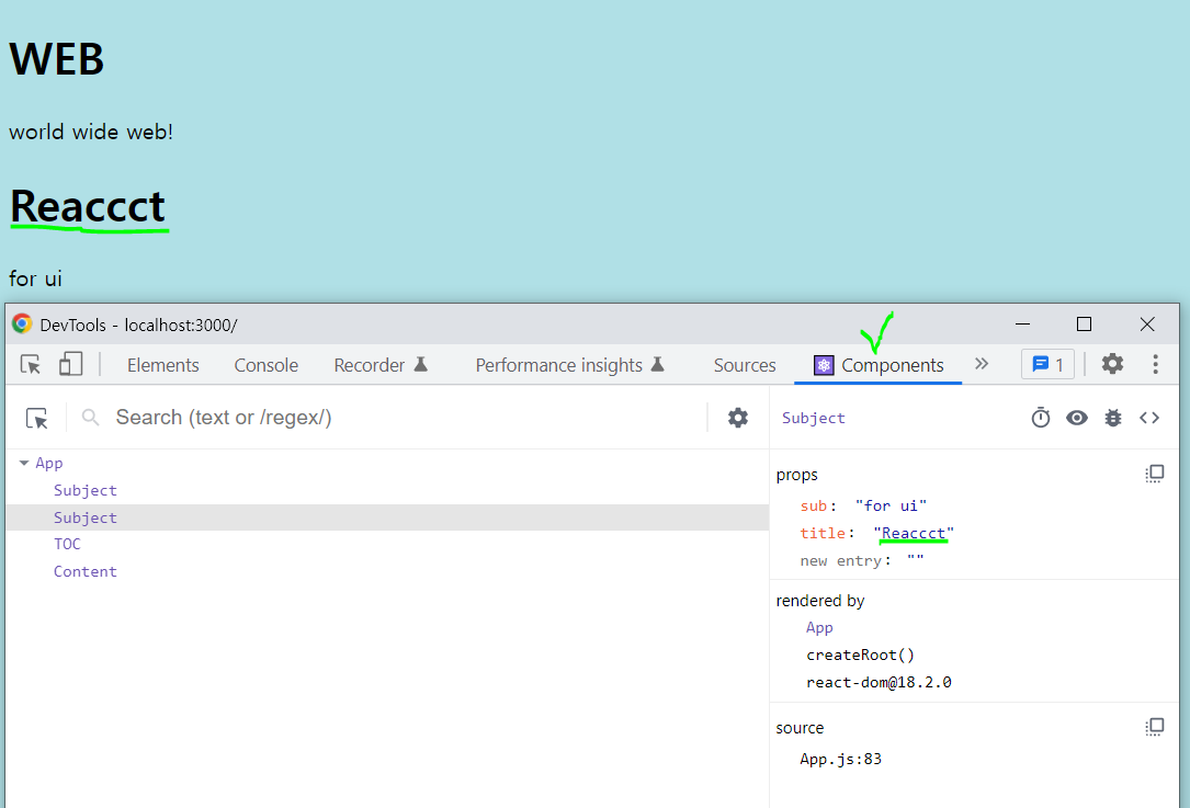 개발자 도구에서 리액트 컴포넌트 확인 가능, 임시 수정 가능