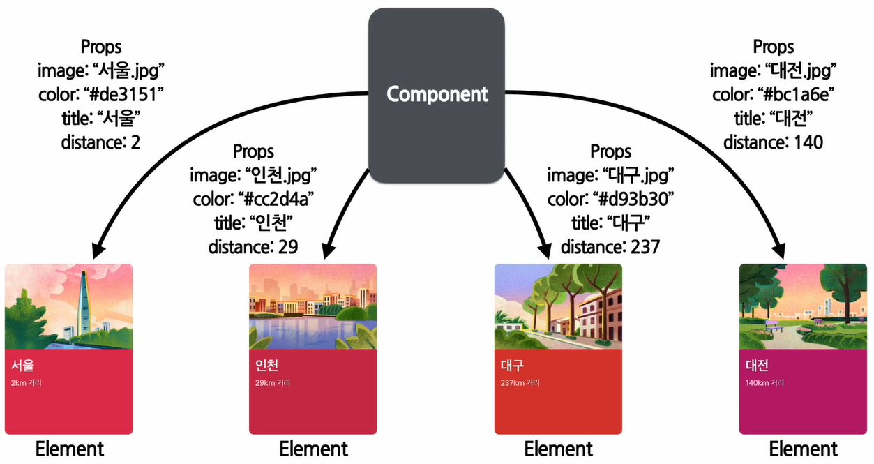 Props의 특징 : Read-only(값 변경x), 값을 변경하기 위해서는 새로운 값을 컴포넌트에 전달하여 새로운 Element 생성, 모든 리액트 컴포넌트는 Props를 직접 바꿀수 없고 같은 Props에 대해서는 항상 같은 결과를 보여줄것