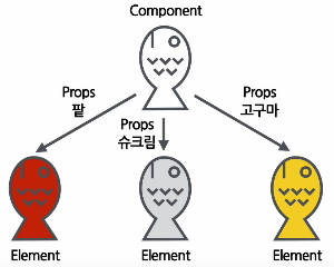 Components : 속성들을 입력으로 받아서 element 생성, 리액트를 구성하는 가장 작은 빌딩블록, JS객체형태, 화면에 보이는 것들 기술, 붕어빵 틀