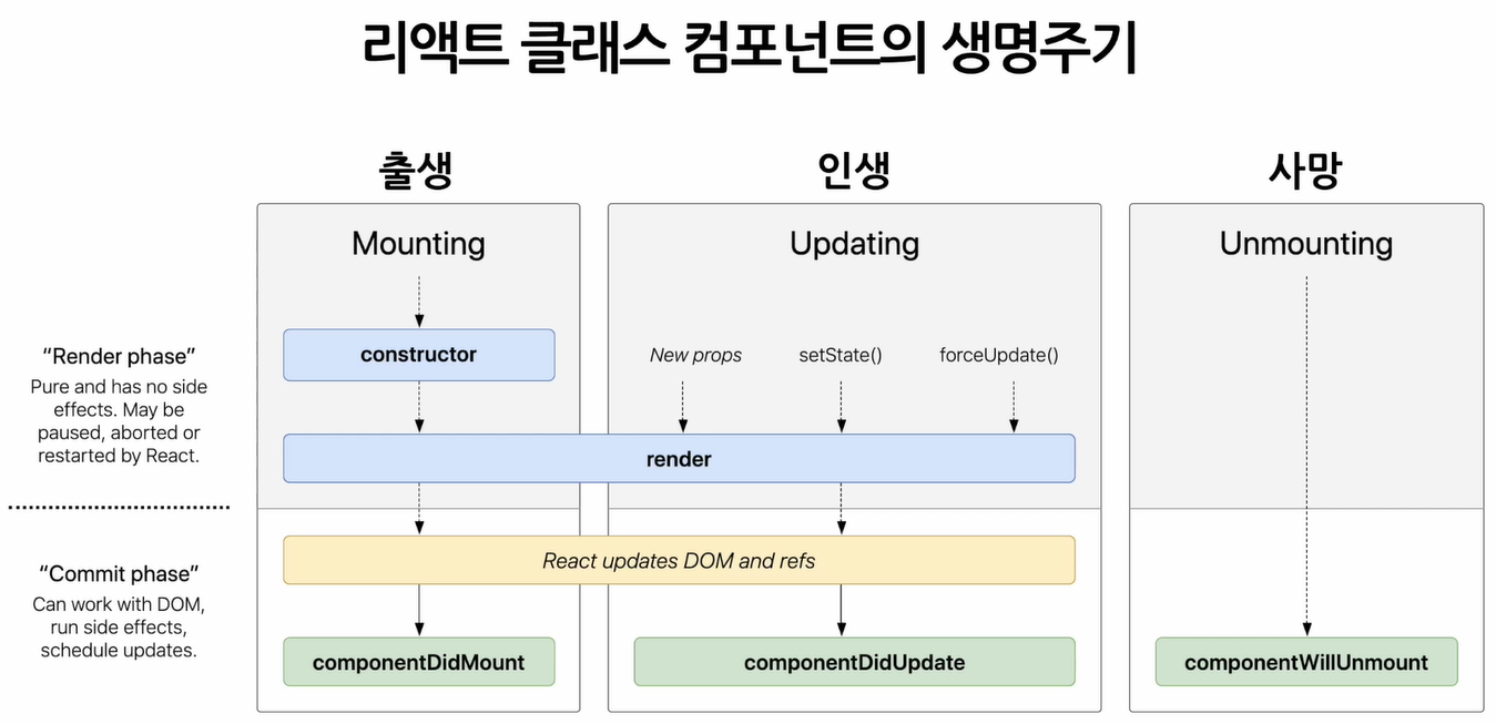 Lifecycle : 리액트 Component의 생명주기, Component가 계속 존재하는 것이 아니라 시간의 흐름에 따라 생성되고 업데이트 되다가 사라진다.