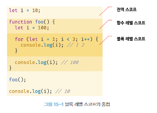 15.2.2 블록 레벨 스코프 : 모든 코드 블록(함수, if문, for문, while문, try/catch문 등)을 지역스코프로 인정