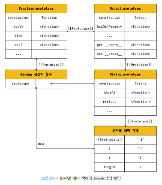 생성자 함수인 표준 빌트인 객체가 생성한 인스턴스의 프로토타입은 표준 빌트인 객체의 prototype 프로퍼티에 바인딩된 객체로 string을 생성자 함수로 호출하여 생성한 String 인스턴스의 프로토 타입은 String.prototype