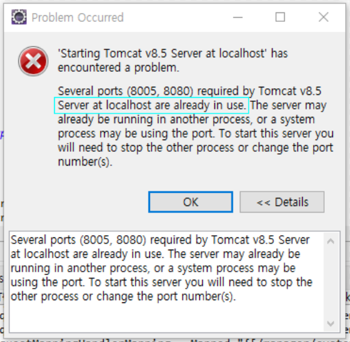 Server at localhost are already in use. : ( port 8005, 8080의 톰캣) 서버가 이미 사용중이다.