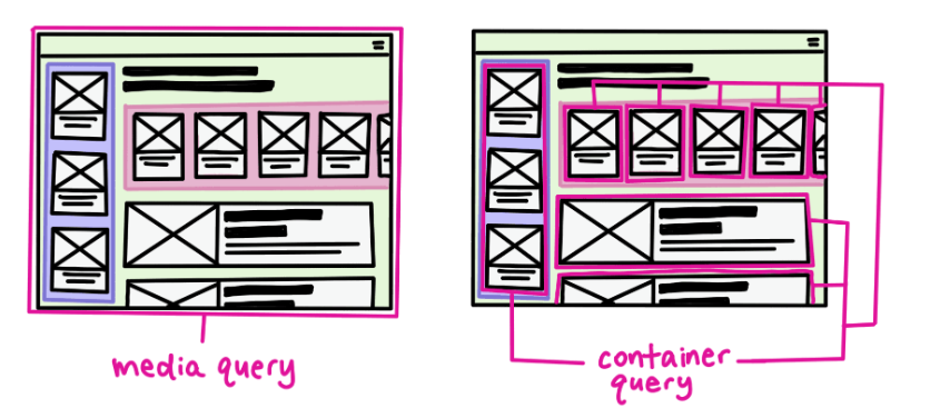 컨테이너 쿼리 vs 미디어 쿼리 컨테이너 쿼리는 미디어 쿼리와 같이 문서의 스타일을 반응형으로 지정할 수 있다. 이 둘의 작동 방식은 유사하지만, 차이점은 어느 것을 기반으로 동작되냐는 점